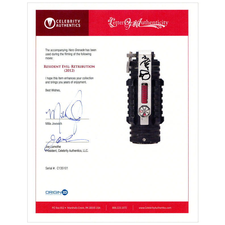 From the 2012 Resident Evil Retribution film is this very rare screen used Umbrella Corporation Grenade personally autographed by franchise star and Alice herself, Milla Jovovich during her signing with Celebrity Authentics. Rare, detailed prop piece measuring approximately 4" H x 2" W, this quality prop piece is made of metal and features the pin in place (non-detonable) with detailed Umbrella Corp logo. As Umbrella Corp.'s deadly T-virus continues to turn the world's population into legions of flesh-eating zombies, Alice (Milla Jovovich), the human race's last hope, awakes deep within Umbrella's secret operations facility. The further she delves into the complex, the more of her mysterious past is unveiled. Her global hunt for those responsible for the outbreak leads to a mind-blowing revelation; Aided by friends old and new, Alice fights to escape from a world on the edge of oblivion. Ships affixed with Celebrity Authentics serial-numbered Authentication hologram and includes Celebrity Authentics Certificate of Authenticity featuring pictures of Milla signing grenade. Includes additional Letter of Authenticity signed by Milla confirming the item's use and on-screen provenance.