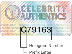 Each hologram features a prefix letter and a unique number that is used to link your collectable to it’s specific signing information.