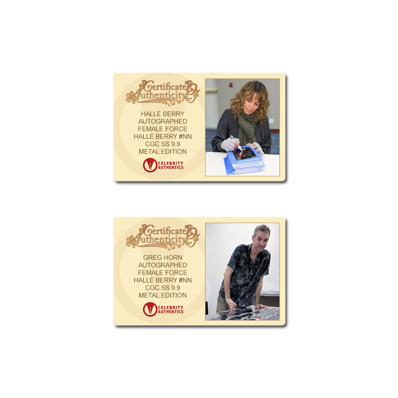 This Female Force: Catwoman with Greg Horn Virgin Variant Metal Cover is graded CGC SS 9.9 (gem mint condition) and has been personally autographed by award winning actress and film legend, Halle Berry and artist Greg Horn during their signings with Celebrity Authentics. From a Limited Edition of only 50 individulaly numbered books! Female Force: Halle Berry is a captivating comic book biography that highlights the life and career of Academy Award-winning actress Halle Berry. From her early struggles and rise to fame in Hollywood to her groundbreaking roles, the comic delves into her personal journey, including the challenges she faced as a Black woman in the entertainment industry. Through resilience and talent, Halle’s story showcases her impact as both an actress and a trailblazer for future generations. Ships in protective case affixed with Celebrity Authentics serial-numbered Authentication hologram and includes Celebrity Authentics Certificates of Authenticity featuring picture of Halle and Greg signing comic.