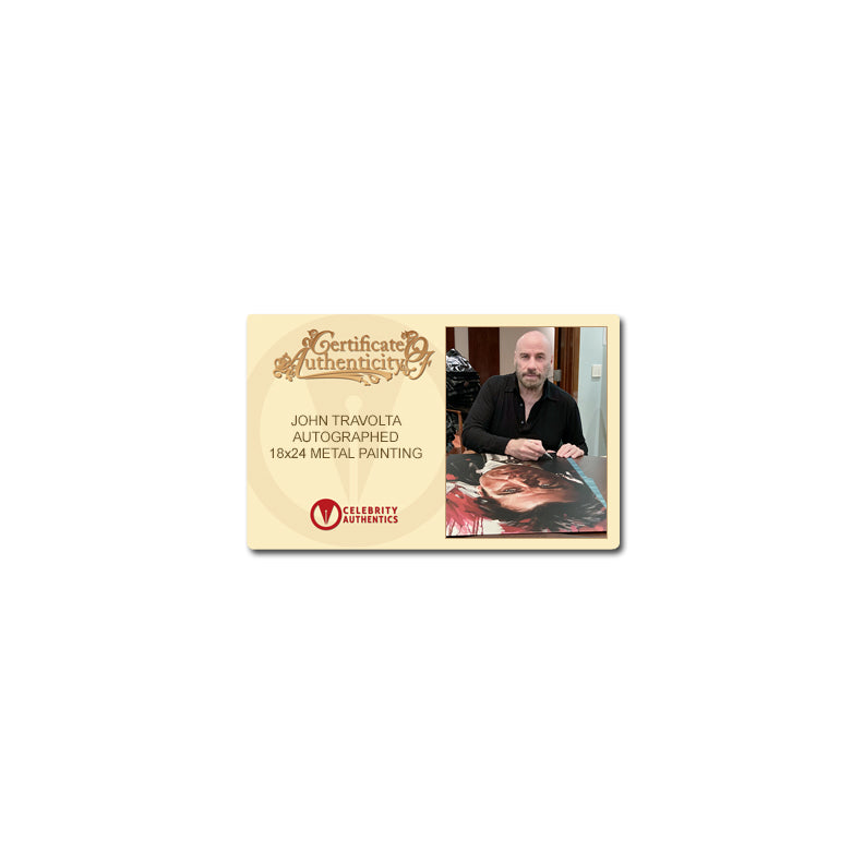 Style, attitude and control, this fantastic 18x24 metal panel embodies the Vincent Vega vibe from Pulp Fiction and has been personally hand-signed by film legend John Travolta during his signing with Celebrity Authentics. Beautifully framed in a rich moulding to perfectly compliment the piece. Vincent Vega (John Travolta) and Jules Winnfield (Samuel L. Jackson) are hitmen with a penchant for philosophical discussions. In this ultra-hip, multi-strand crime movie, their storyline is interwoven with those of their boss, gangster Marsellus Wallace (Ving Rhames) ; his actress wife, Mia (Uma Thurman) ; struggling boxer Butch Coolidge (Bruce Willis) ; master fixer Winston Wolfe (Harvey Keitel) and a nervous pair of armed robbers, "Pumpkin" (Tim Roth) and "Honey Bunny" (Amanda Plummer). Ships affixed with the Celebrity Authentics serial-numbered and tamper evident Authentication Hologram and includes Celebrity Authentics Certificate of Authenticity featuring a picture of John signing the panel.