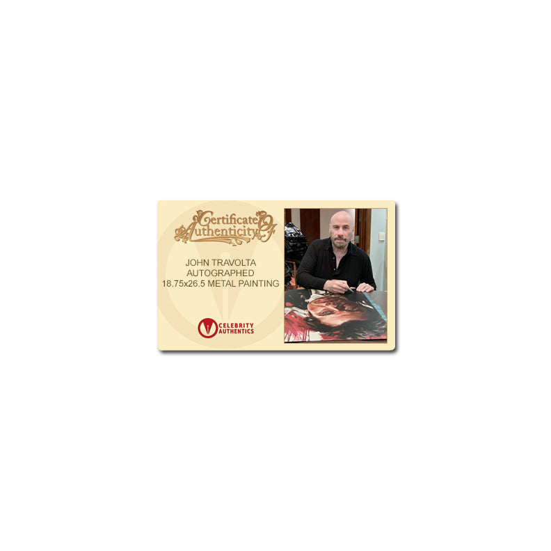Style, attitude and control, this fantastic 18.75x26.5 (23x30.5 Framed) metal panel embodies the Vincent Vega vibe from Pulp Fiction and has been personally hand-signed by film legend John Travolta during his signing with Celebrity Authentics. Beautifully framed in a rich moulding to perfectly compliment the piece. Vincent Vega (John Travolta) and Jules Winnfield (Samuel L. Jackson) are hitmen with a penchant for philosophical discussions. In this ultra-hip, multi-strand crime movie, their storyline is interwoven with those of their boss, gangster Marsellus Wallace (Ving Rhames) ; his actress wife, Mia (Uma Thurman) ; struggling boxer Butch Coolidge (Bruce Willis) ; master fixer Winston Wolfe (Harvey Keitel) and a nervous pair of armed robbers, "Pumpkin" (Tim Roth) and "Honey Bunny" (Amanda Plummer). Ships affixed with the Celebrity Authentics serial-numbered and tamper evident Authentication Hologram and includes Celebrity Authentics Certificate of Authenticity featuring a picture of John signing the panel.