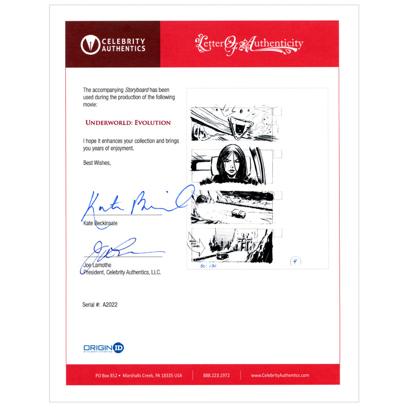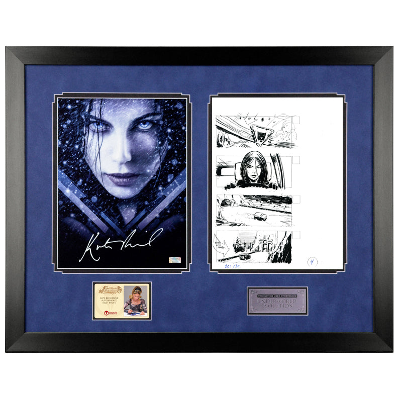 This beautifully designed 2006 Underworld Evolution Framed Display features a stunning 8.5"x11" photo printed on rich, metallic stock of Selene, personally hand-signed by franchise star Kate Beckinsale during her exclusive signing with Celebrity Authentics. Adding to this impressive display is an original production used storyboard illustrating camera moves, scene framing and more. This one of a kind display features a precision cut, custom metallic plate further identifying this rare production used piece. Seductive vampire Selene (Kate Beckinsale) and renegade werewolf Michael (Scott Speedman) love one another, but find themselves abhorred by the members of their own clans. Seeking clues that might provide a key to healing the rift between their species, they are hounded by Marcus (Tony Curran), an ancient creature obsessed with perpetuating the war between them. Continually beset by enemies from both sides, the lovers explore their pasts as they seek their destiny. Ships with photo affixed with Celebrity Authentics serial-numbered and tamper evident Authentication Hologram with Celebrity Authentics Certificate of Authenticity featuring picture of Kate signing photo. Additionally includes Celebrity Authentics Letter of Authenticity personally signed by franchise star Kate Beckinsale, verifying the storyboard's production use and provenance. Don’t miss out on this fantastic piece of Underworld memorabilia.