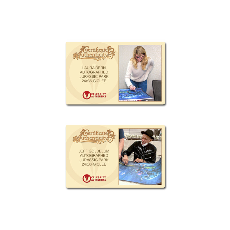 This sold out Jurassic Park 24x36 Poster by Paul Mann has been personally autographed by the iconic franchise trio of Sam Neill (Dr Alan Grant), Jeff Goldblum (Dr Ian Malcolm) and Laura Dern (D Ellie Sattler) during their signings with Celebrity Authentics. From a sold out limited edition of 250 prints, each individually hand-numbered and with less than 8 of these beautiful prints signed by the iconic trio! In Steven Spielberg's massive blockbuster, paleontologists Alan Grant (Sam Neill) and Ellie Sattler (Laura Dern) and mathematician Ian Malcolm (Jeff Goldblum) are among a select group chosen to tour an island theme park populated by dinosaurs created from prehistoric DNA. While the park's mastermind, billionaire John Hammond (Richard Attenborough), assures everyone that the facility is safe, they find out otherwise when various ferocious predators break free and go on the hunt. Ships affixed with Celebrity Authentics serial-numbered Authentication hologram and includes Celebrity Authentics Certificates of Authenticity featuring pictures of Sam, Laura and Jeff signing.