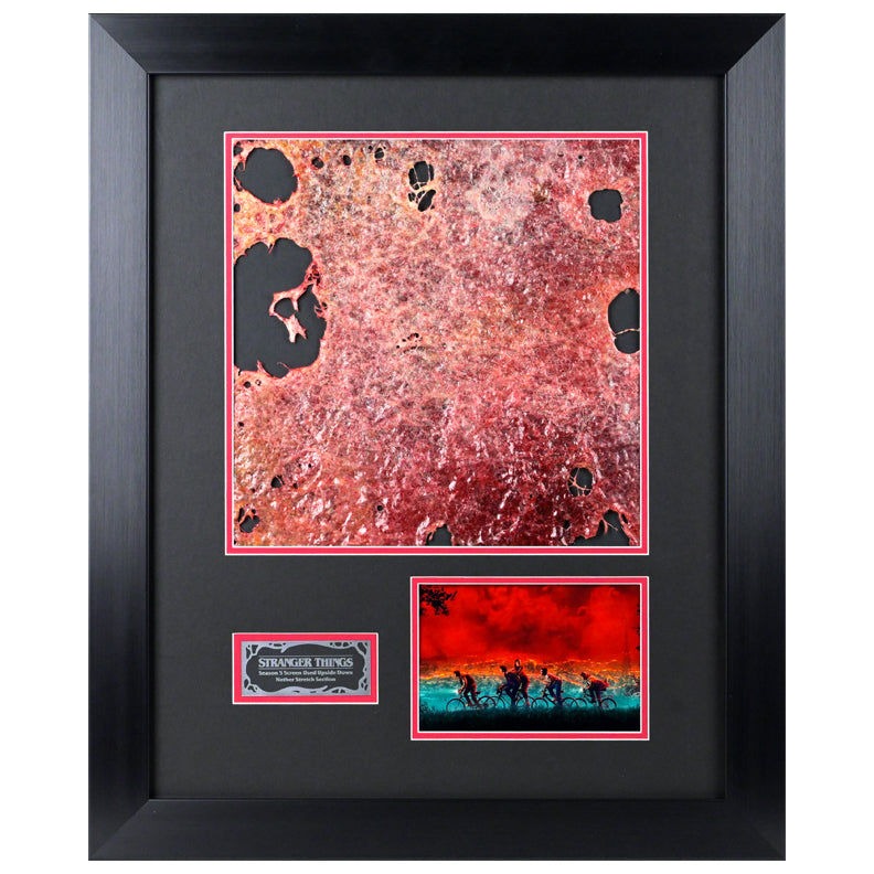 Direct from the set of Stranger Things is this rare, large piece of Neither Stretch from the Upside Down beautifully framed in this stunning, themed display. Neither stretch is approximately 10" x 10" with display measuring approximately 15" wide x 18" in height framed. The Neither stretch is a fleshy, skin like substance used in the lining of the Upside Down inner sanctum. It truly helps to set the tone and define the terrifying feel of the Upside Down! Obtained by a crew member who worked on the set, this item was used during the production and filming of Season 5. Genuine screen and production used items from Stranger Things are extremely rare and highly sought after. This item includes the Celebrity Authentics Letter of Authenticity personally hand-signed by the crew member verifying the item’s production/screen use and provenance.
