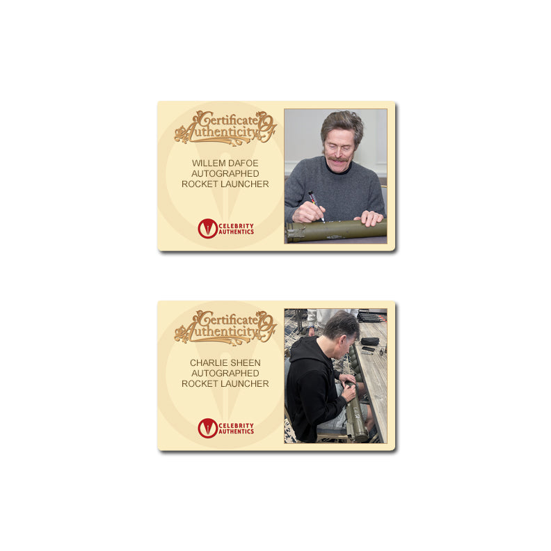 This Authentic Rocket Launcher (as seen used in Platoon) has been personally autographed by Willem Dafoe and Charlie Sheen during their signings with Celebrity Authentics. An extremely rare signed collectible, Rocket Launcher measures about 25" in length with a max with of 6", is unloaded and genuine, exhibiting signs of prior use. Stamped with For Training Use Only with added Invert-Law text for reminding soldiers. Chris Taylor (Charlie Sheen) leaves his university studies to enlist in combat duty in Vietnam in 1967. Once he's on the ground in the middle of battle, his idealism fades. Infighting in his unit between Staff Sergeant Barnes, who believes nearby villagers are harboring Viet Cong soldiers, and Sergeant Elias (Willem Dafoe), who has a more sympathetic view of the locals, ends up pitting the soldiers against each other as well as against the enemy. Ships affixed with Celebrity Authentics serial-numbered Authentication hologram and includes Celebrity Authentics Certificate of Authenticity featuring pictures of Willem and Charlie signing rocket launcher.